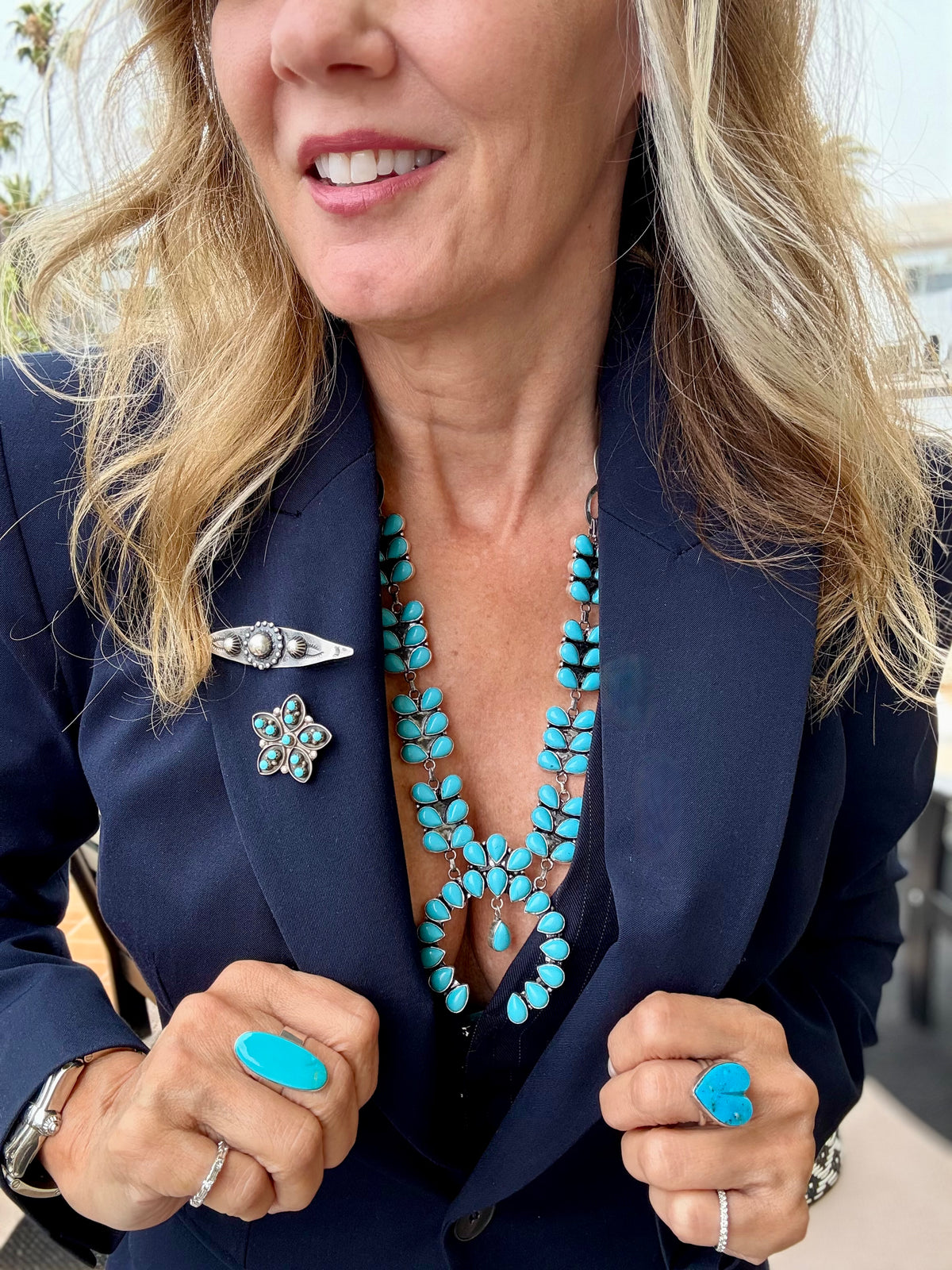 Timeless and iconic, this Sleeping Beauty turquoise squash blossom necklace showcases the pure, vivid blue hue that made this Arizona turquoise legendary. Each hand-cut stone is carefully set in sterling silver, forming the classic squash blossom silhouette with a beautifully balanced naja centerpiece.